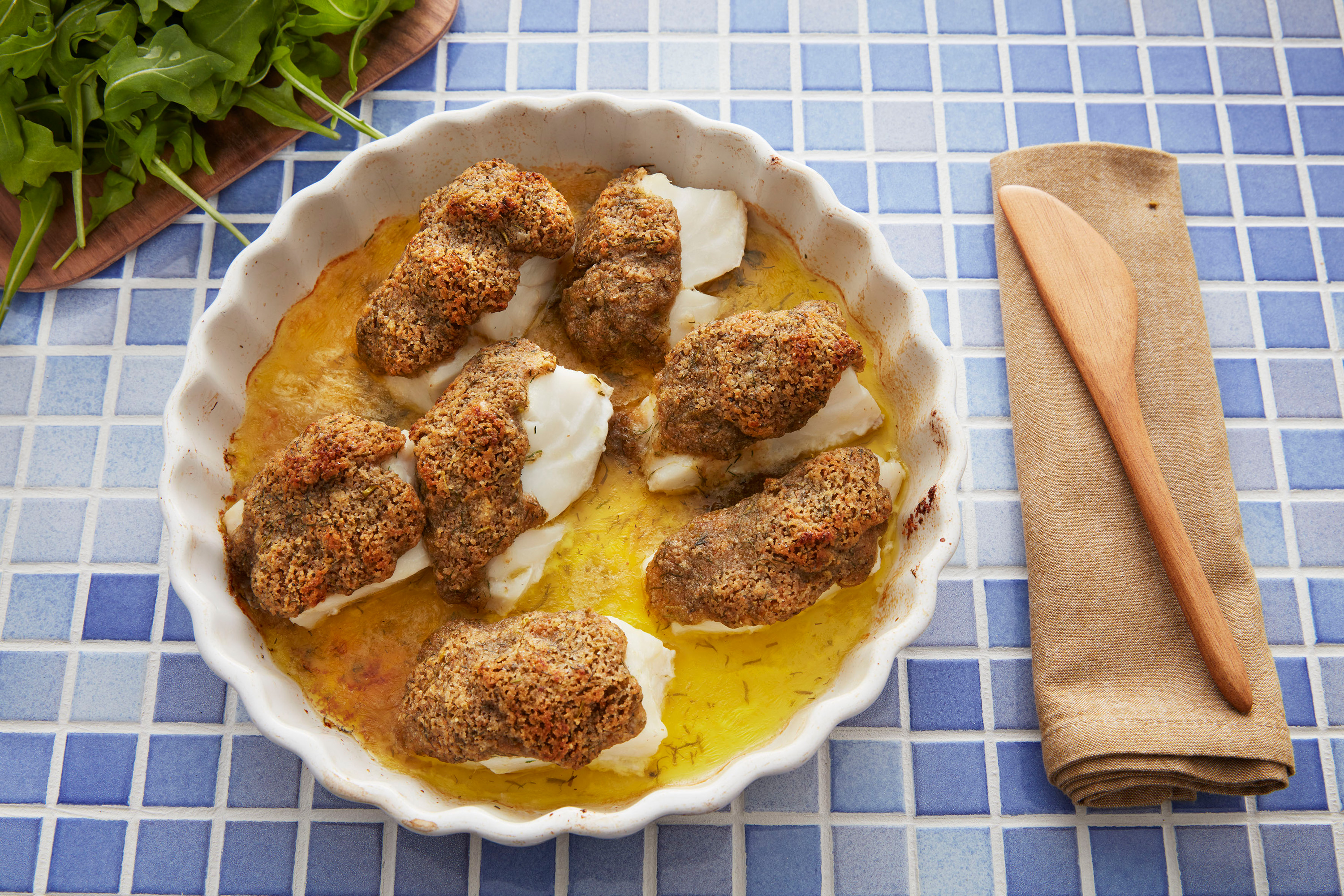 - While the potatoes boil, cut the fish into small pieces and finely chop the rosemary leaves.